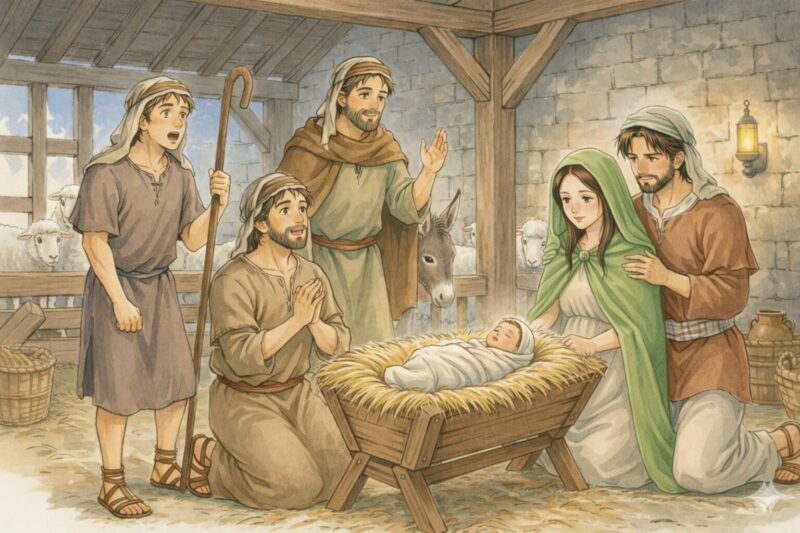 集まった人々は顔を見合わせた。「そんなことが……」「救い主が、この子だと?」ざわめきの中に、畏れと驚きが広がっていく。
