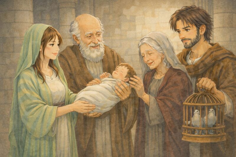ヨセフはマリアと顔を見合わせ、うなずいた。シメオンは震える手で幼子を抱き上げると、天を仰いだ。