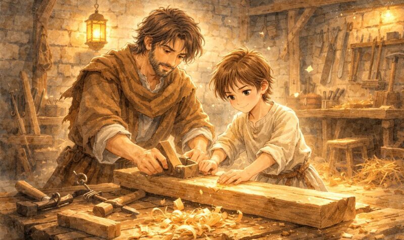 ヨセフの仕事場には、木の香りが満ちている。削る音、打つ音、汗のにおい。イエスは真剣な眼差しで、ひとつひとつの作業を覚えていった。