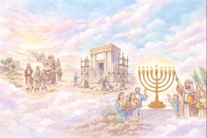 パレスチナに帰還したユダヤ人たちを待っていたのは、七十年ものあいだ荒れ果てたままの神殿であった。物資も人手も乏しい中、彼らは妨害や失望に直面しながら、それでも真の崇拝を回復するために再建の労に取り組んだ。その苦難に満ちた歩みは、エズラ記やエレミヤ記などの書からうかがい知ることができる。